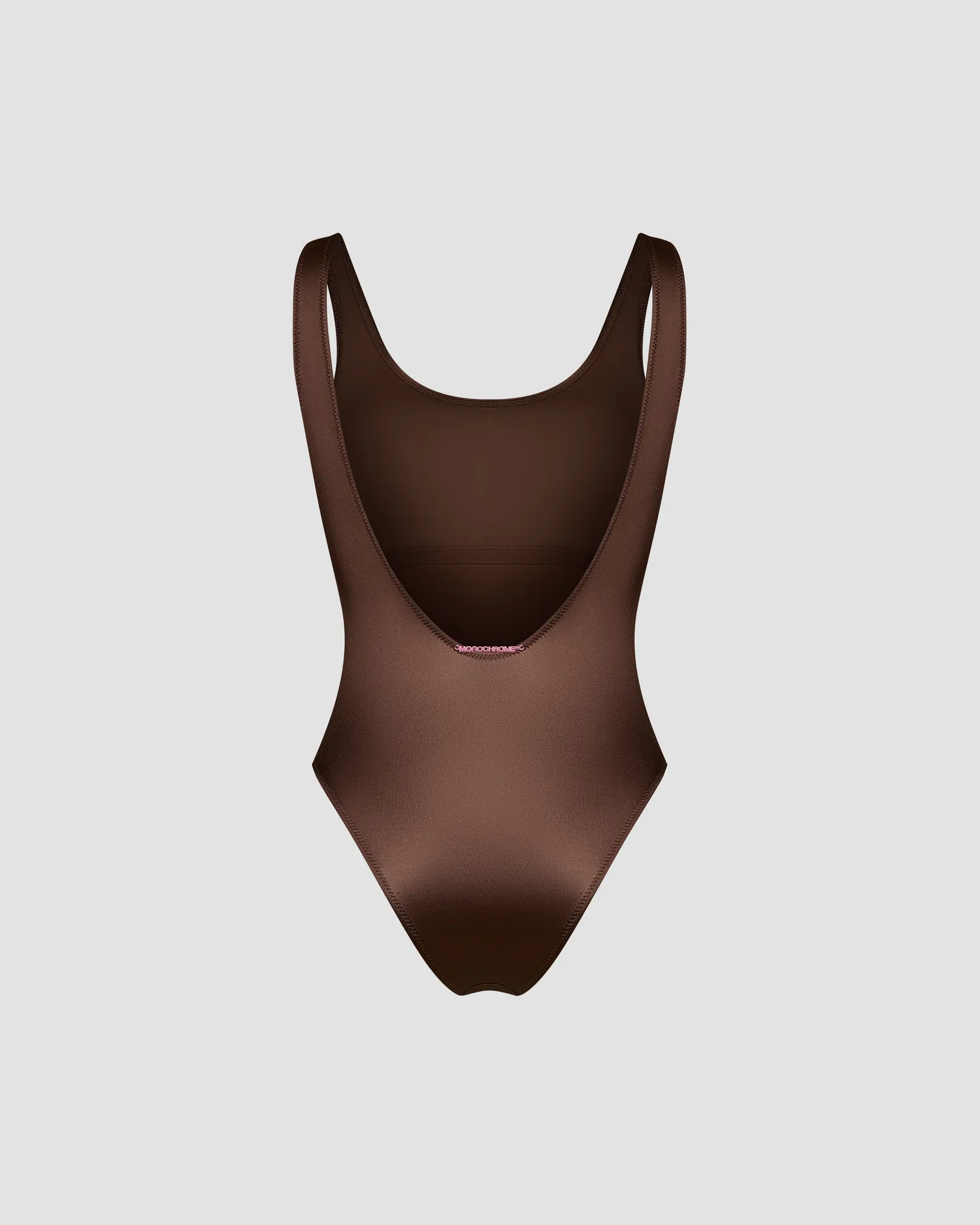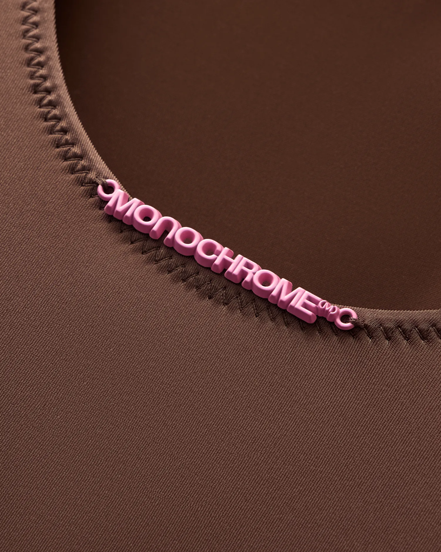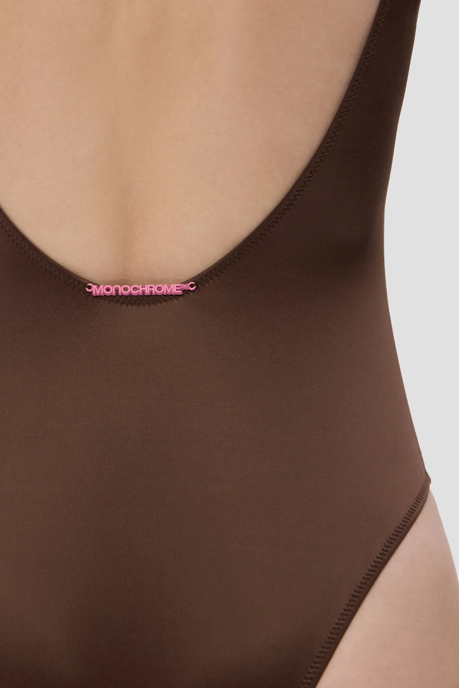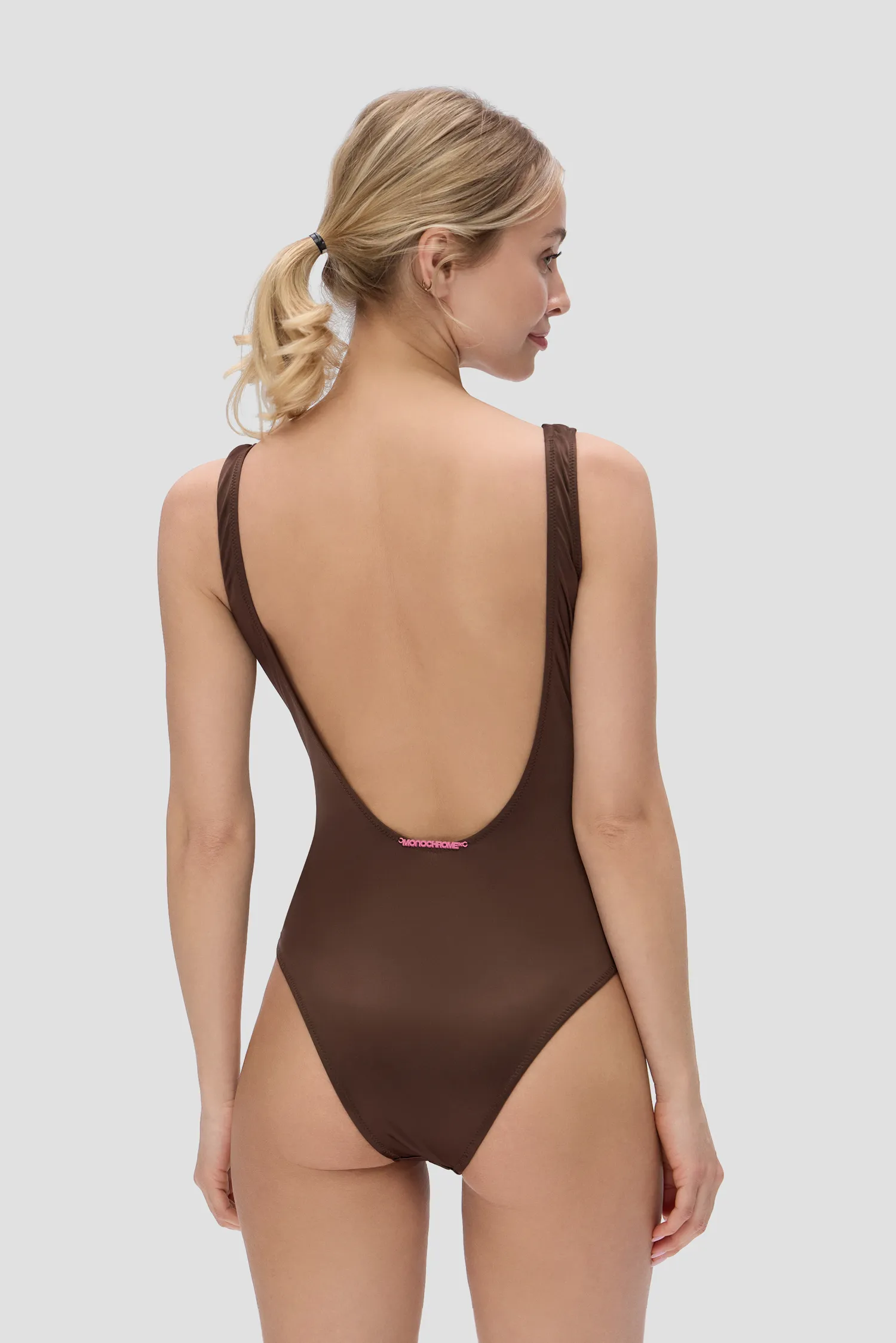 Слитный купальник коричневого цвета. Классическое бра с поддержкой груди и съёмными чашечками. Широкие бретели. Глубокий U-образный вырез на спине. Фирменный металлический логотип MONOCHROME в розовом цвете. Подходит для бассейна и открытой воды. Упакован в фирменную косметичку из водонепроницаемого материала и в подарочную коробку.