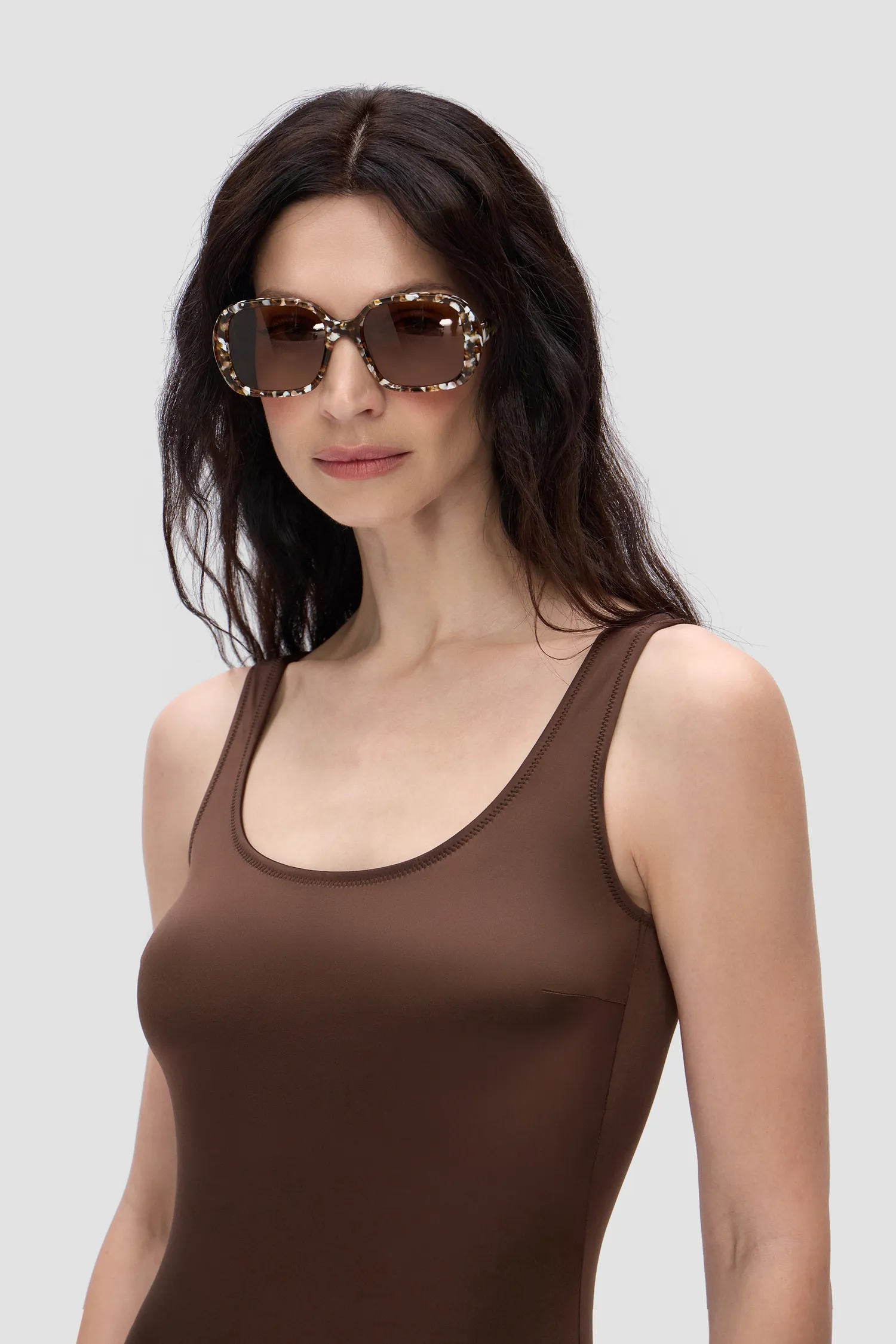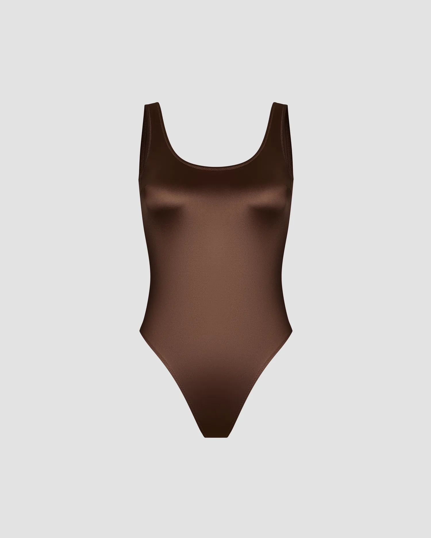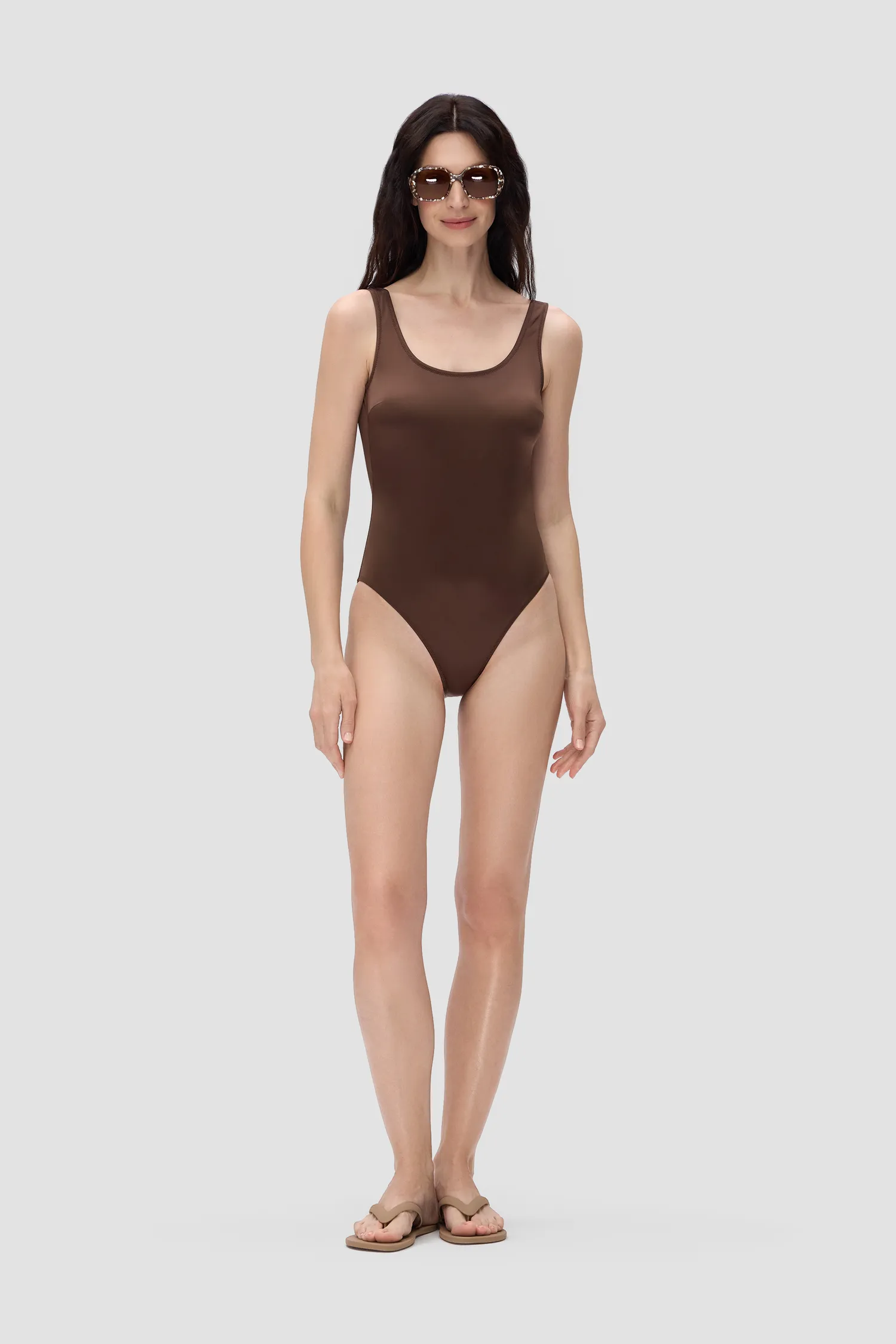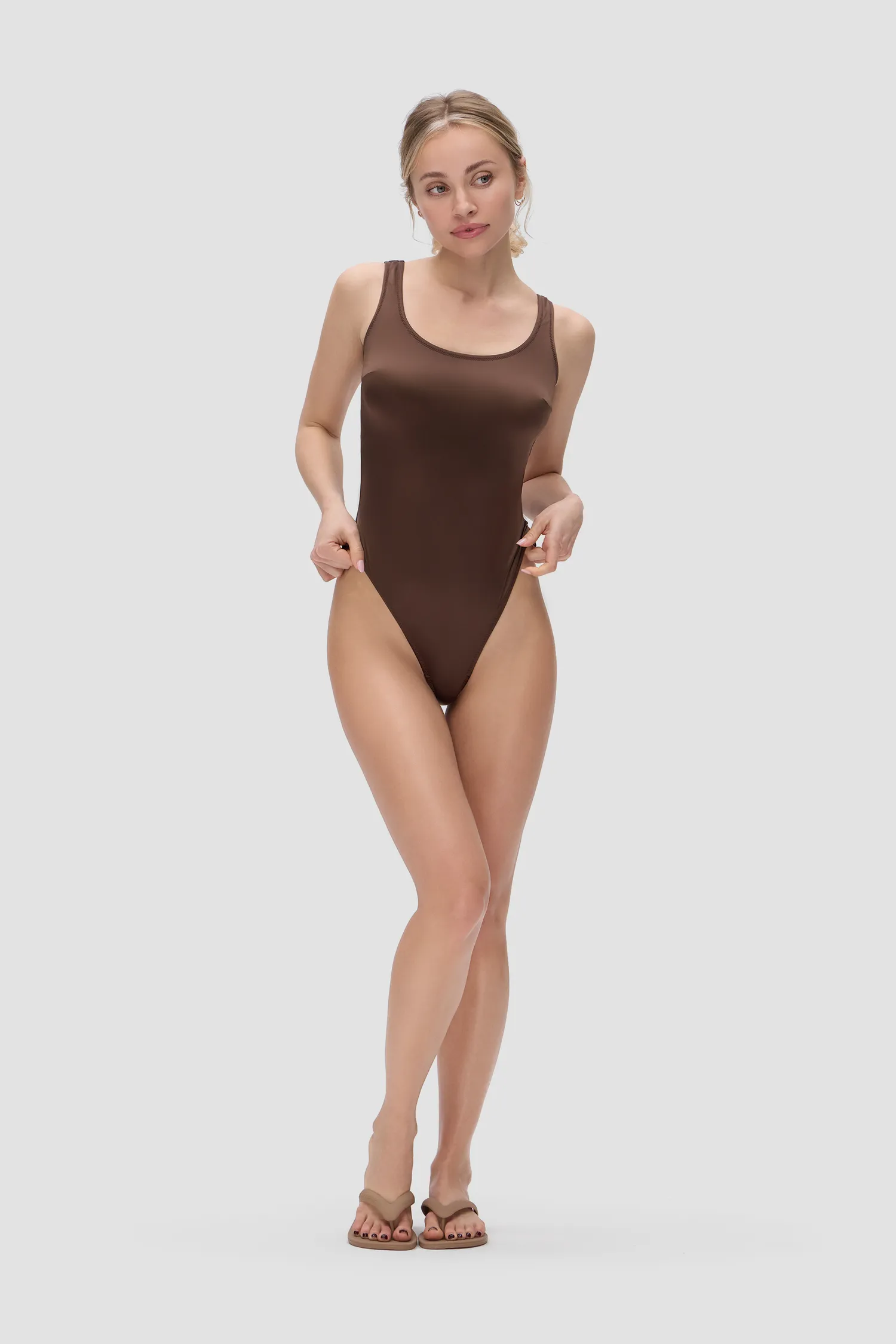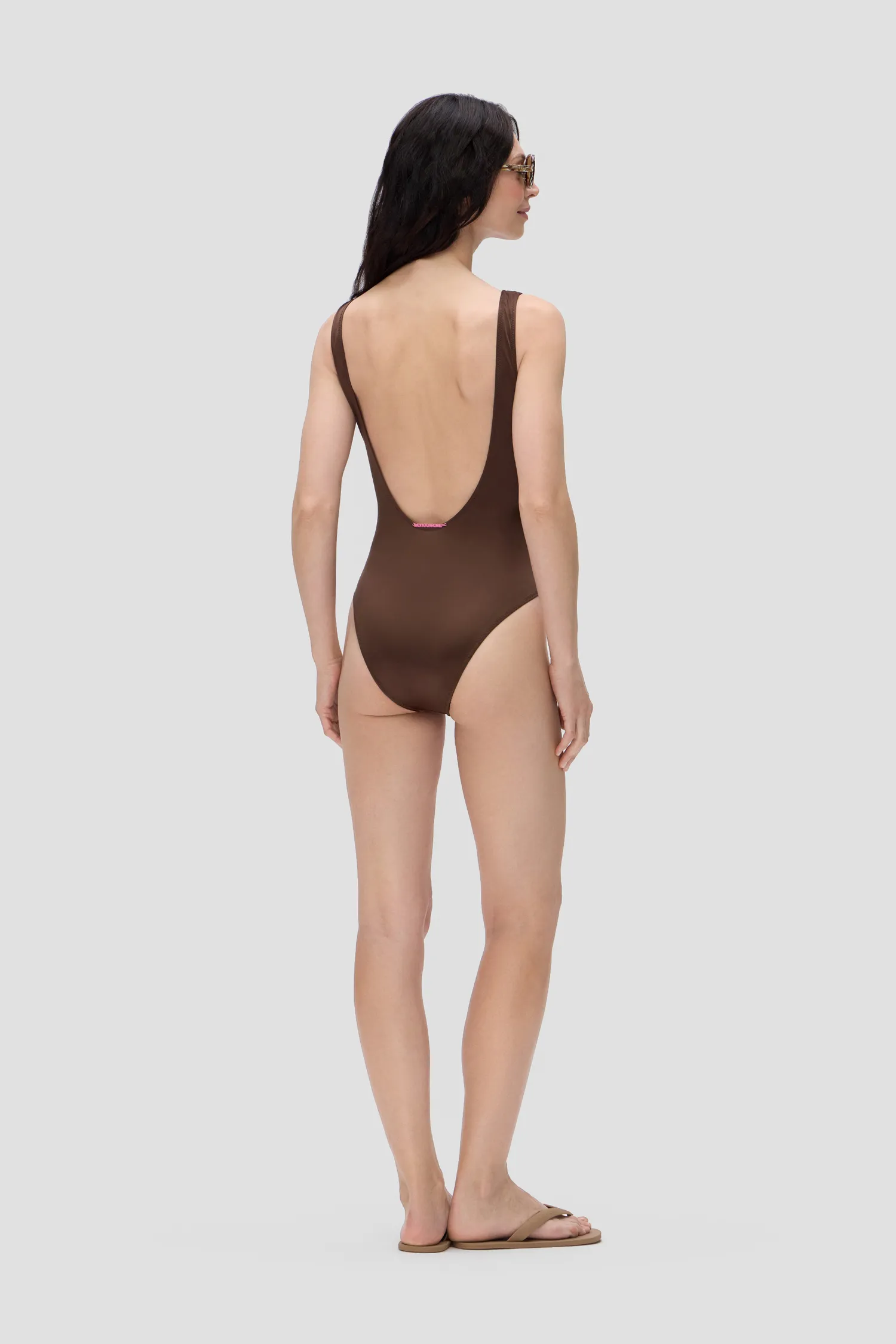 Слитный купальник коричневого цвета. Классическое бра с поддержкой груди и съёмными чашечками. Широкие бретели. Глубокий U-образный вырез на спине. Фирменный металлический логотип MONOCHROME в розовом цвете. Подходит для бассейна и открытой воды. Упакован в фирменную косметичку из водонепроницаемого материала и в подарочную коробку.
