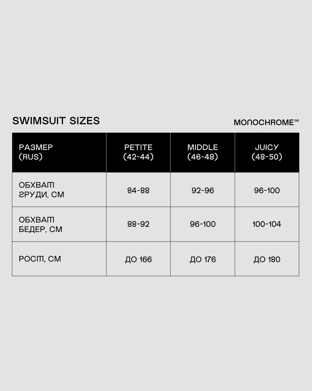Указанные размеры являются стандартными и могут варьироваться в зависимости от индивидуальных особенностей фигуры. Эластичная ткань купальника адаптируется к разным типам телосложения, поэтому посадка может отличаться.